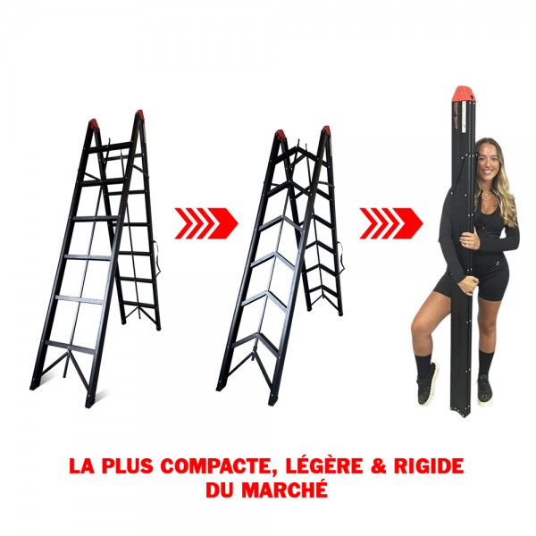 Fabriqué en aluminium renforcé, cet escabeau offre une rigidité incomparable tout en restant léger (7,5 kg).