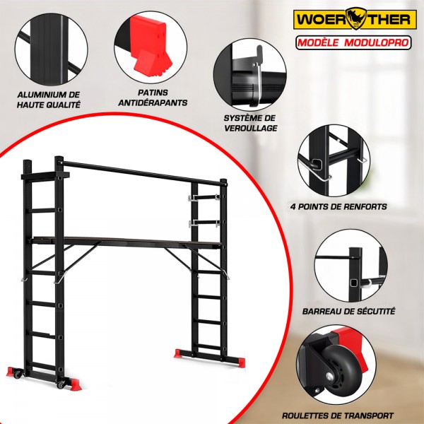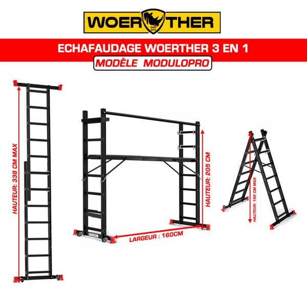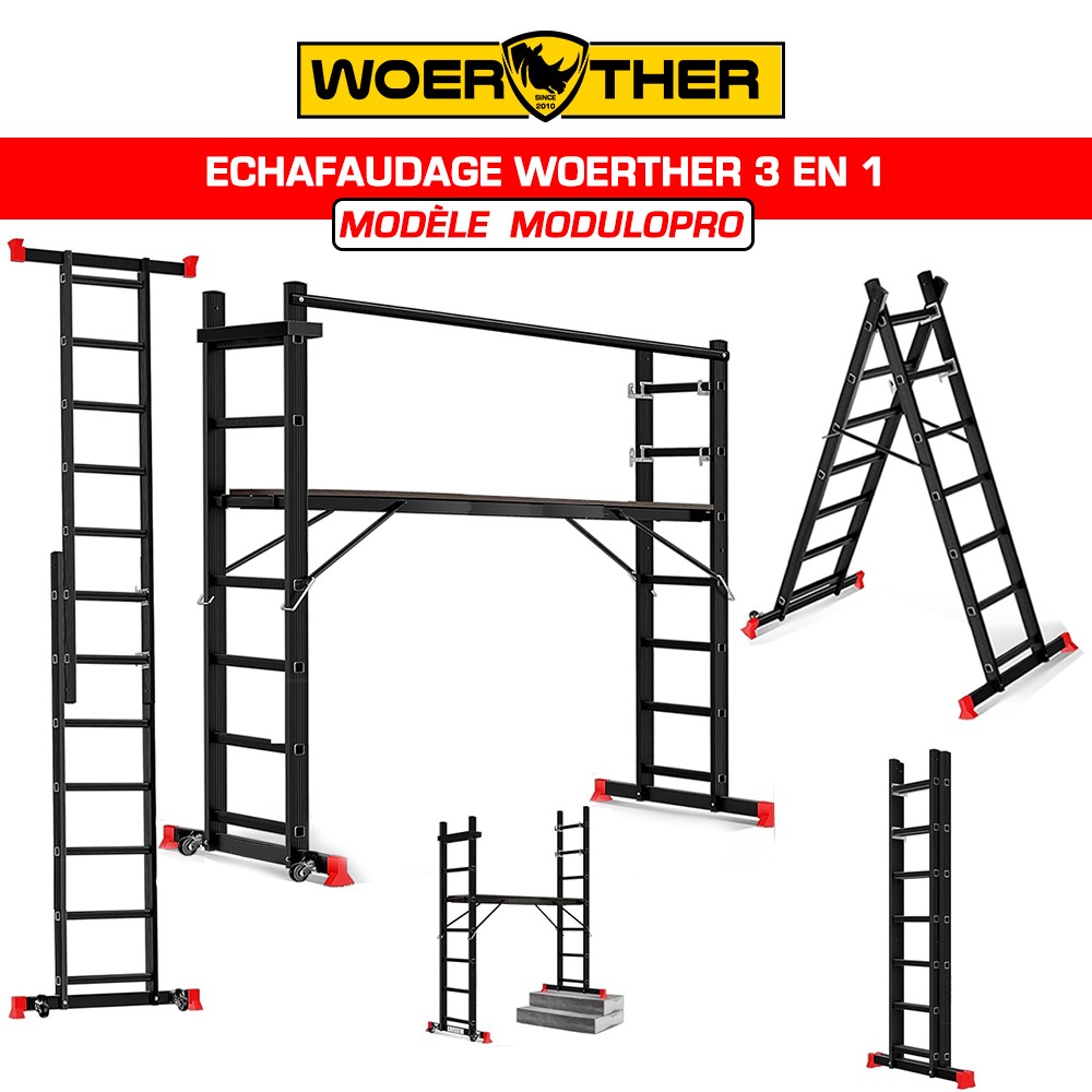 L’échafaudage WOERTHER MODULOPRO 3 est une solution polyvalente et compacte, conçue pour travailler en hauteur en toute sécurité. Grâce à ses 3 configurations (échafaudage, escabeau, échelle), il s’adapte facilement à tous les chantiers.