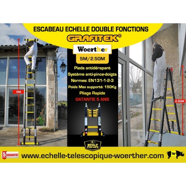 ECHELLE ESCABEAU 2 FONCTIONS - 2 BARRES STABILISATRICES, GRAFITEK 5M/2M50 - AVEC SAC A OUTILS